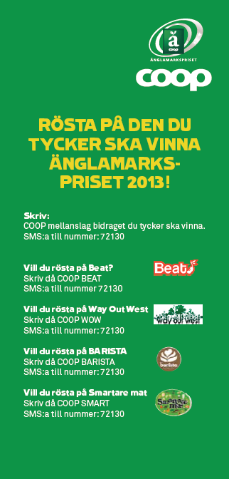 Skriv COOP mellanslag bidraget du tycker ska vinna och skicka det som SMS till 72130.